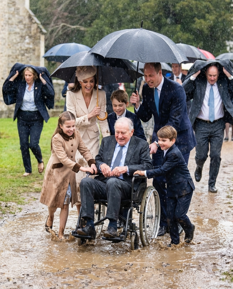 Hearing Louis's call, William, Louis's father, quickly gathered the family. "We need to help him!" he said decisively. Without hesitation, Louis, along with his siblings George and Charlotte, rushed toward the old man. Together they pushed him out of the mud and ensured he was safe from the harsh weather. Meanwhile, their mother, William and Catherine, comforted him, shielding him from the rain with umbrellas and offering words of reassurance.