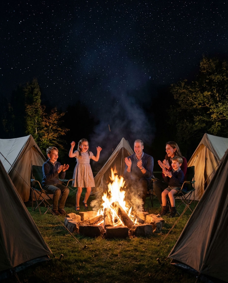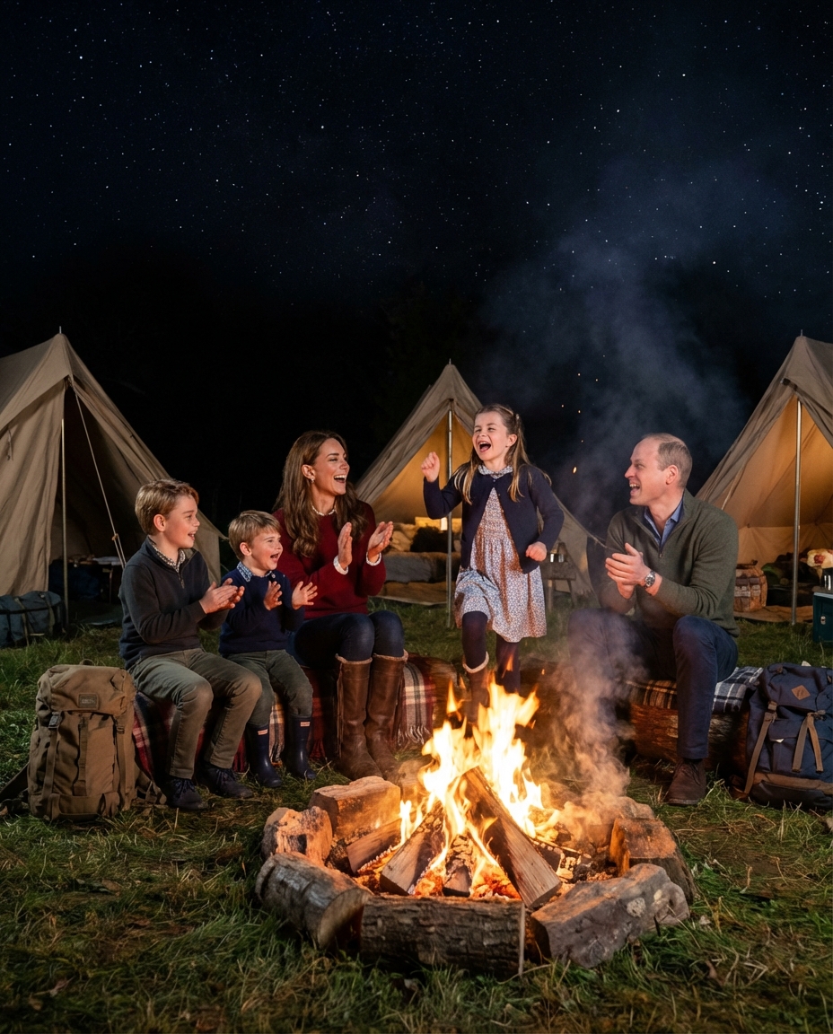 The day began with the family setting up camp, complete with tents and a cozy fire pit. The children, Prince George, Princess Charlotte, and Prince Louis, were eager to explore, gather branches, and play games. The royal parents personally guided their children through essential camping skills, from pitching tents to fire safety measures.
