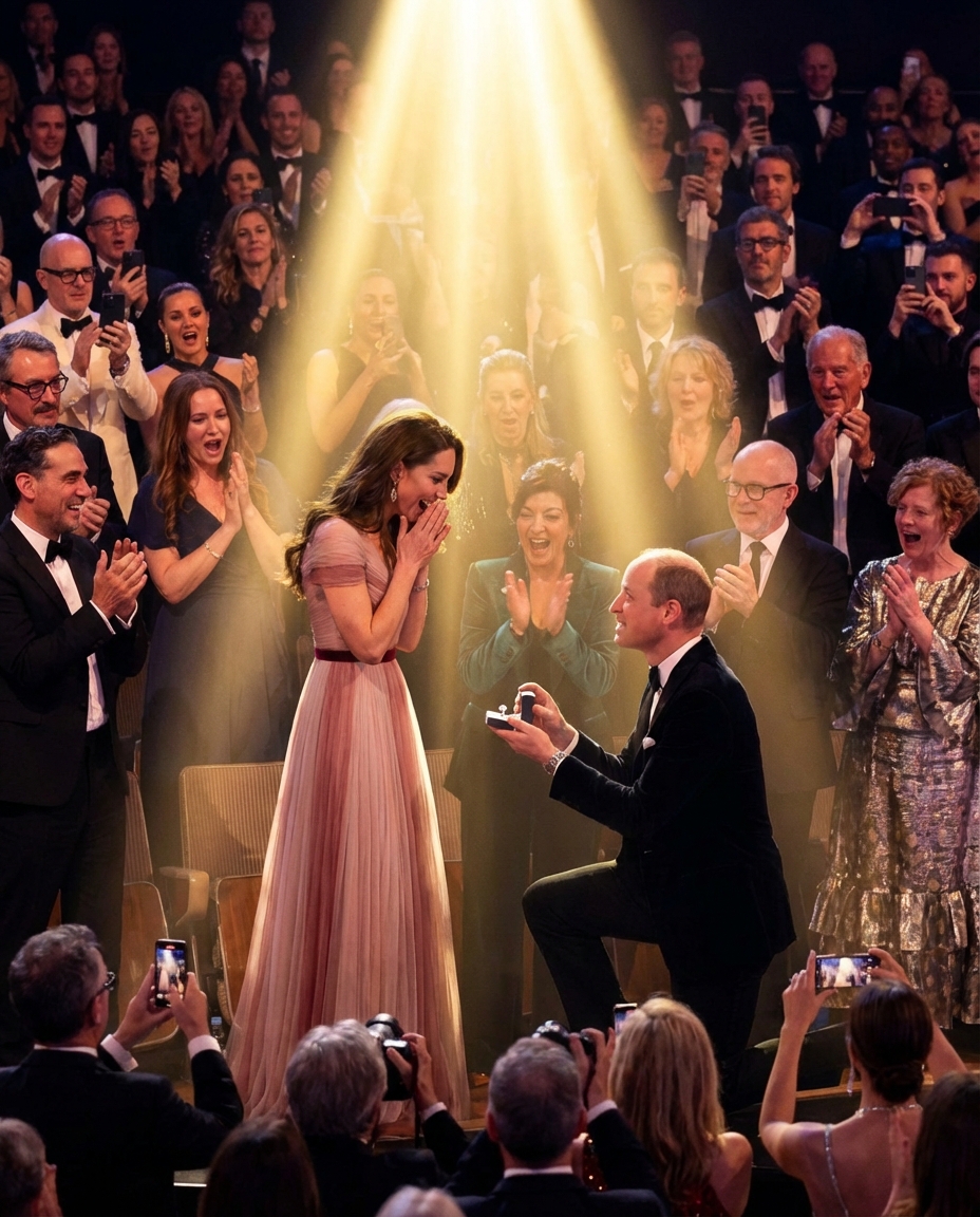 As the ceremony progressed, Prince William and Princess Catherine sat among the stars, enjoying the performances and speeches. Unexpectedly, in a moment that left everyone stunned, Prince William stood up, took a deep breath, and declared, "I love you!" The room fell silent, all eyes fixed on the royal couple. Then, he knelt down, revealing a stunning diamond ring sparkling under the hall lights.