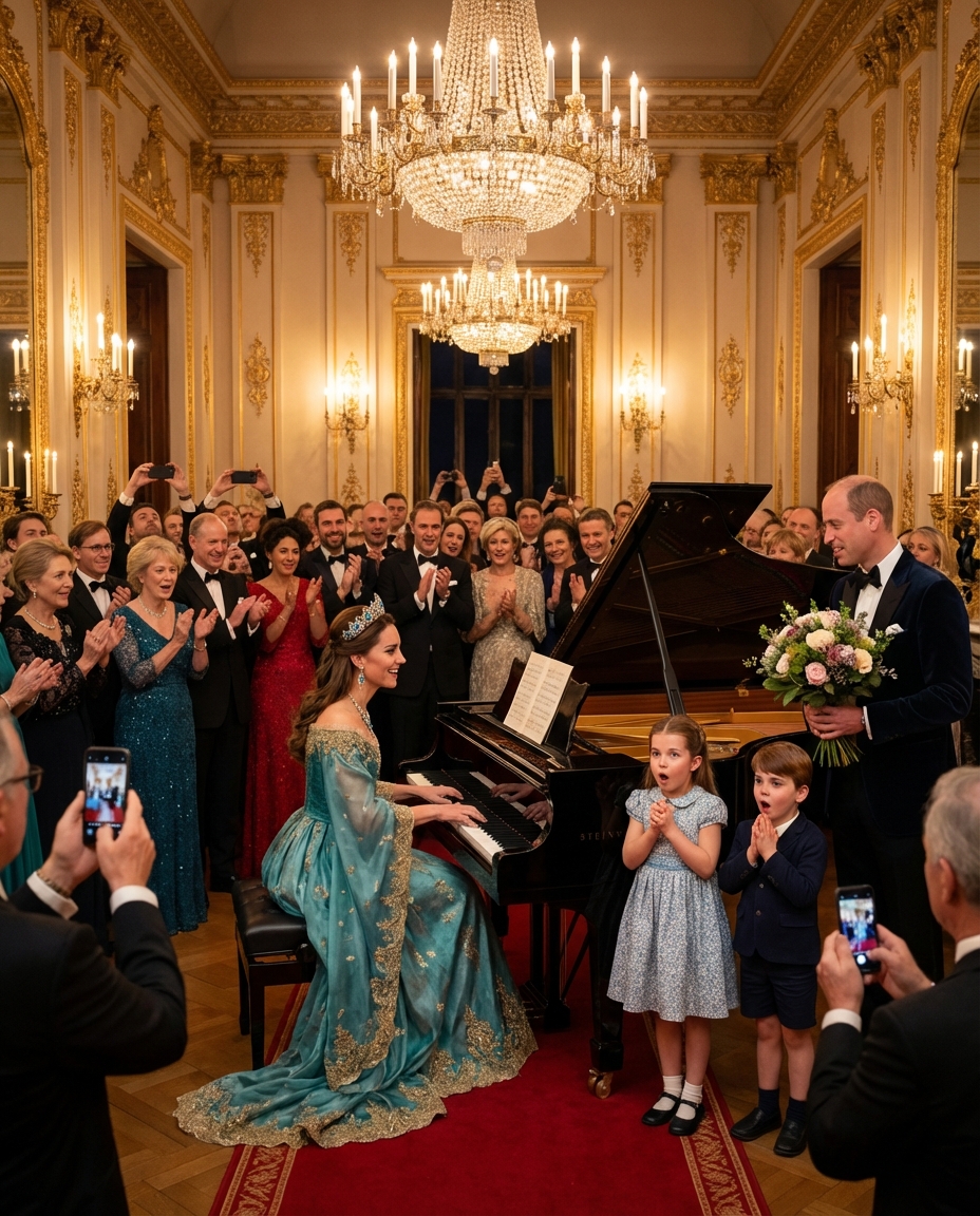 As Princess Catherine took her seat at the piano, the room fell silent. Her dress, a spectacular blend of elegance and modernity, accentuated her grace and confidence. The delicate fabric flowed gracefully with her every movement, each note she played resonating with emotion. Her performance was not merely a display of technical skill but a genuine expression of her love for music.