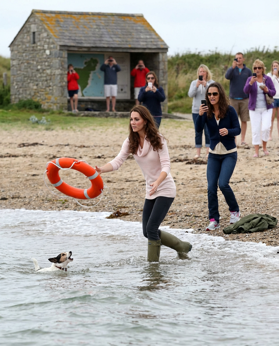 Witnesses said that while enjoying a day at the beach, a small dog was spotted struggling in the water, clearly in danger. Its desperate cries for help caught the attention of Princess Catherine, who was nearby. Without hesitation, she waded into the water, demonstrating quick thinking and a willingness to help. Witnesses described the scene as both tense and inspiring, as the princess reached for a lifebuoy to throw to the distressed animal.