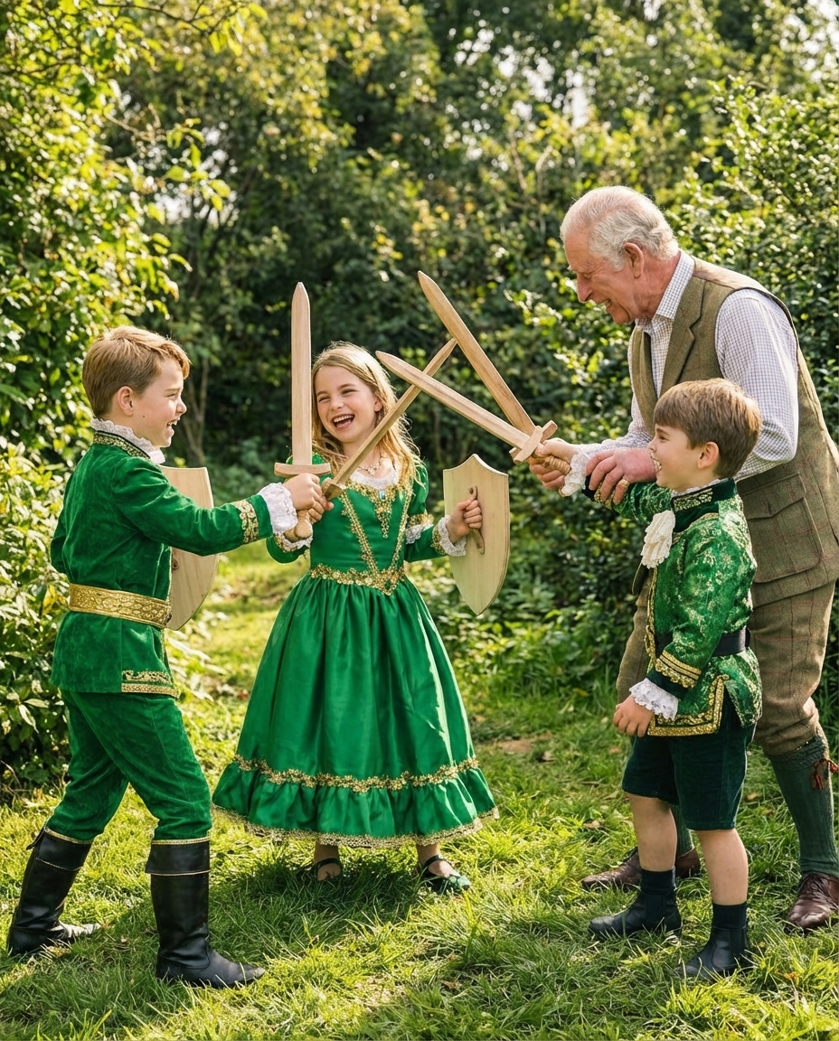 On this beautiful day, the royal gardens transformed into an imaginary battlefield as Princess Charlotte, Prince Louis, and Prince George brandished their wooden swords and shields. The three children laughed and chattered as they pretended to fight alongside King Charles, who played the role of a valiant king. This joyful participation not only highlighted the children's close relationship with their grandfather but also reflected the importance of imaginative play in children's development.